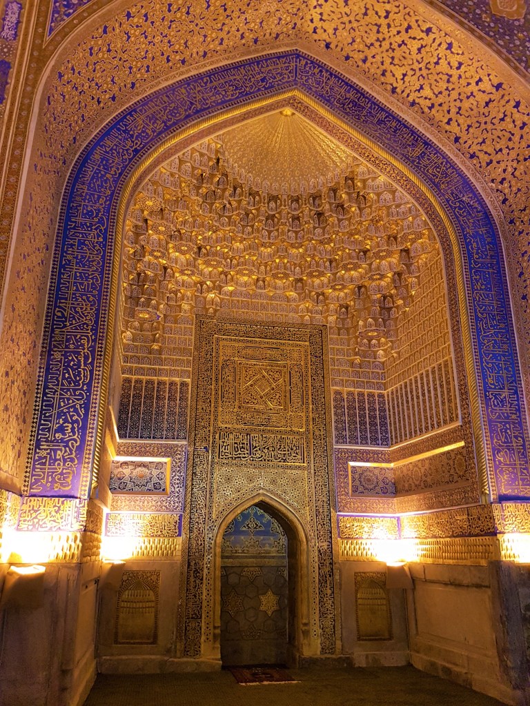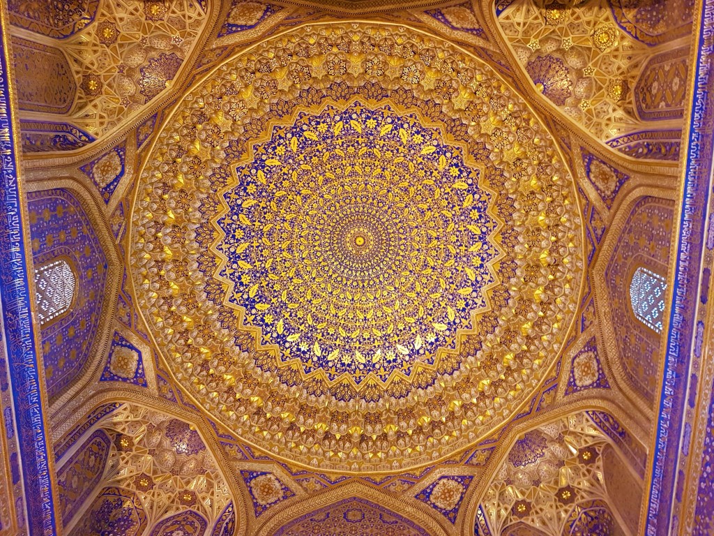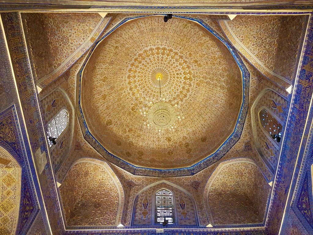 It is the central madrasah, Tilya Kori Madrasah, that is truly spectacular. The name Tilya-Kori means decorated with gold and it is just that. Inside there is a room decorated with pure gold and built as an illusion to make it appear the roof has a dome but in actuality it is just flat.