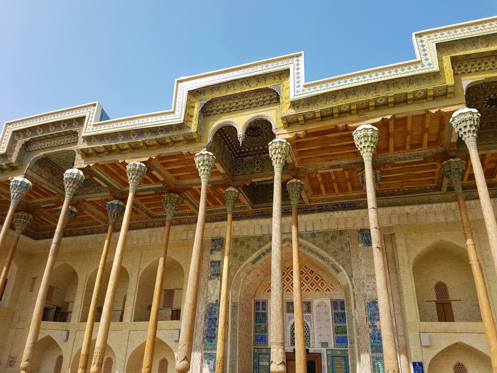 The Emir of Bukhara used to perform Friday prayers in this unique mosque. Forty wooden pillars each with different wooden carvings support the ceiling giving it an unusual but spectacular design.