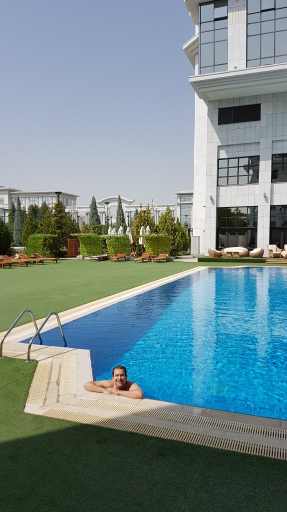 My home in Ashgabat was the Hotel Nusay. It is a fantastic, luxurious, comfortable, luxurious, beautiful and did I mention luxurious? hotel in the centre of Ashgabat. Complete with helpful reception staff, ATM’s, two small souvenir stores and a carpet store, a fantastic restaurant, a deserted bar, and a relaxing pool area.