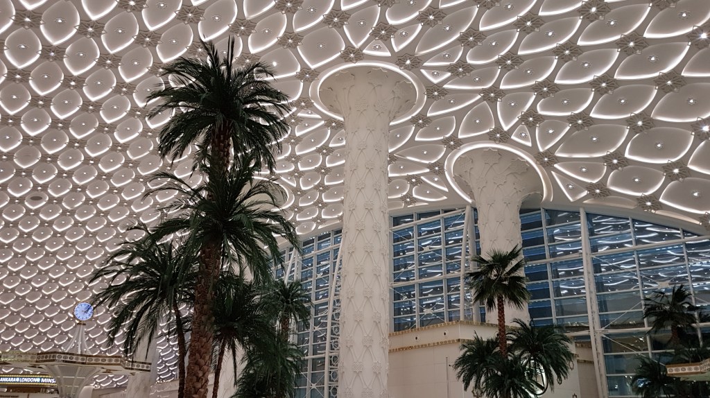 The airport fits in very well with the rest of the city’s buildings. It is also very strange in that there are lot of gates but not many flights – perhaps planning for the future? The schedule of flights for the whole day, from my 4am flight time to Dubai, to the end of the day could be seen on one page on the display screen.